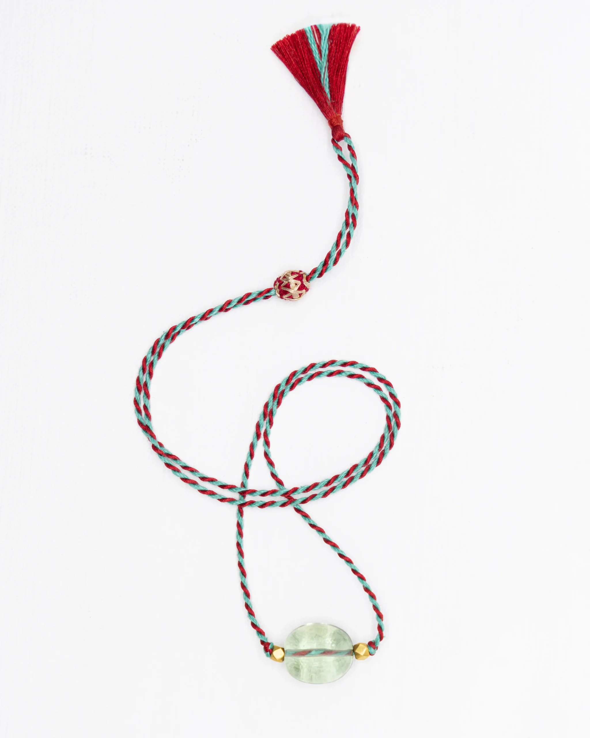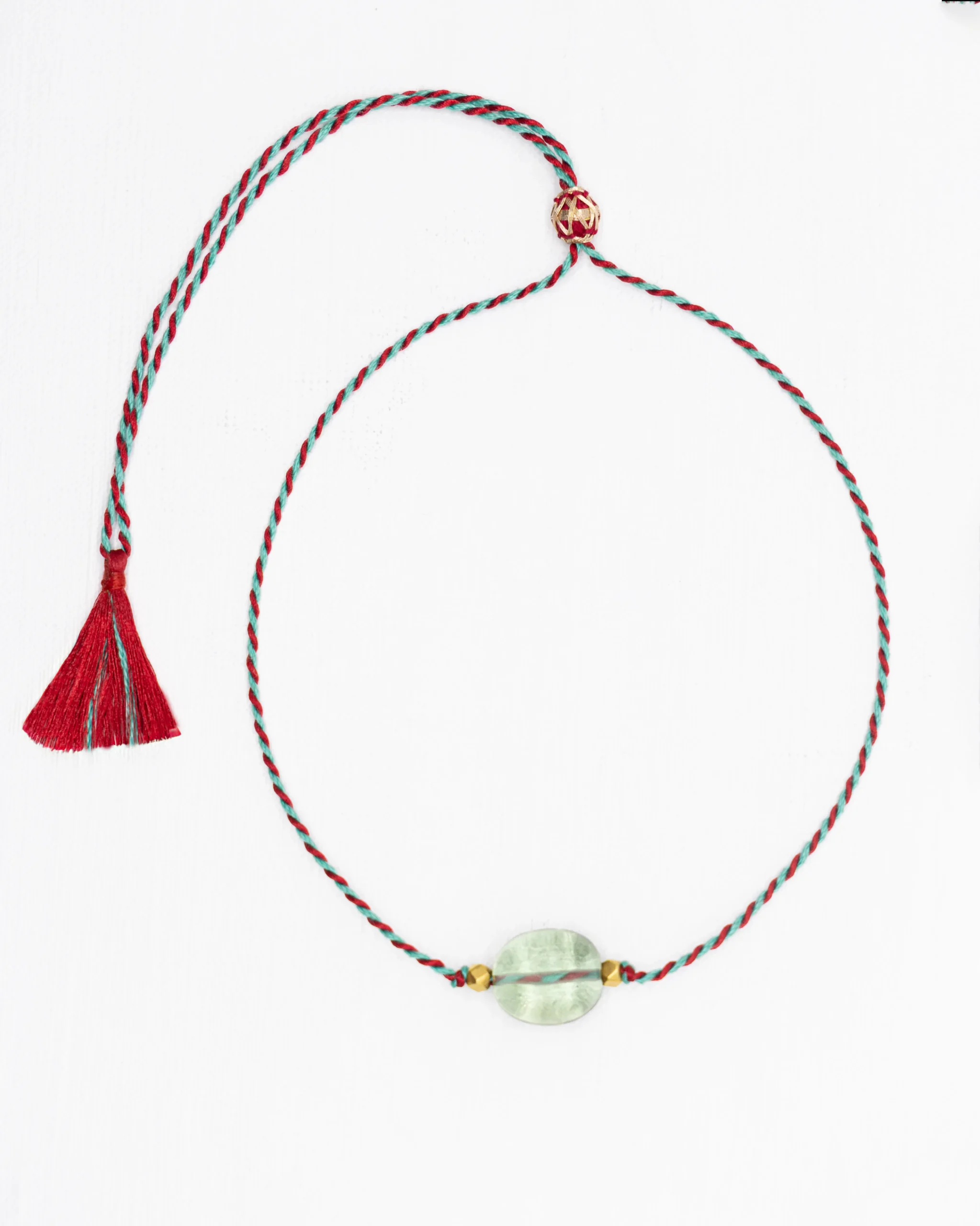 Our signature cords are hand-twisted in silk and cotton by traditional artisans in India. Each features a carved Snakefruit stone at its center, gold elements throughout, and an adjustable closure finished with a zari-thread slide and tassel.