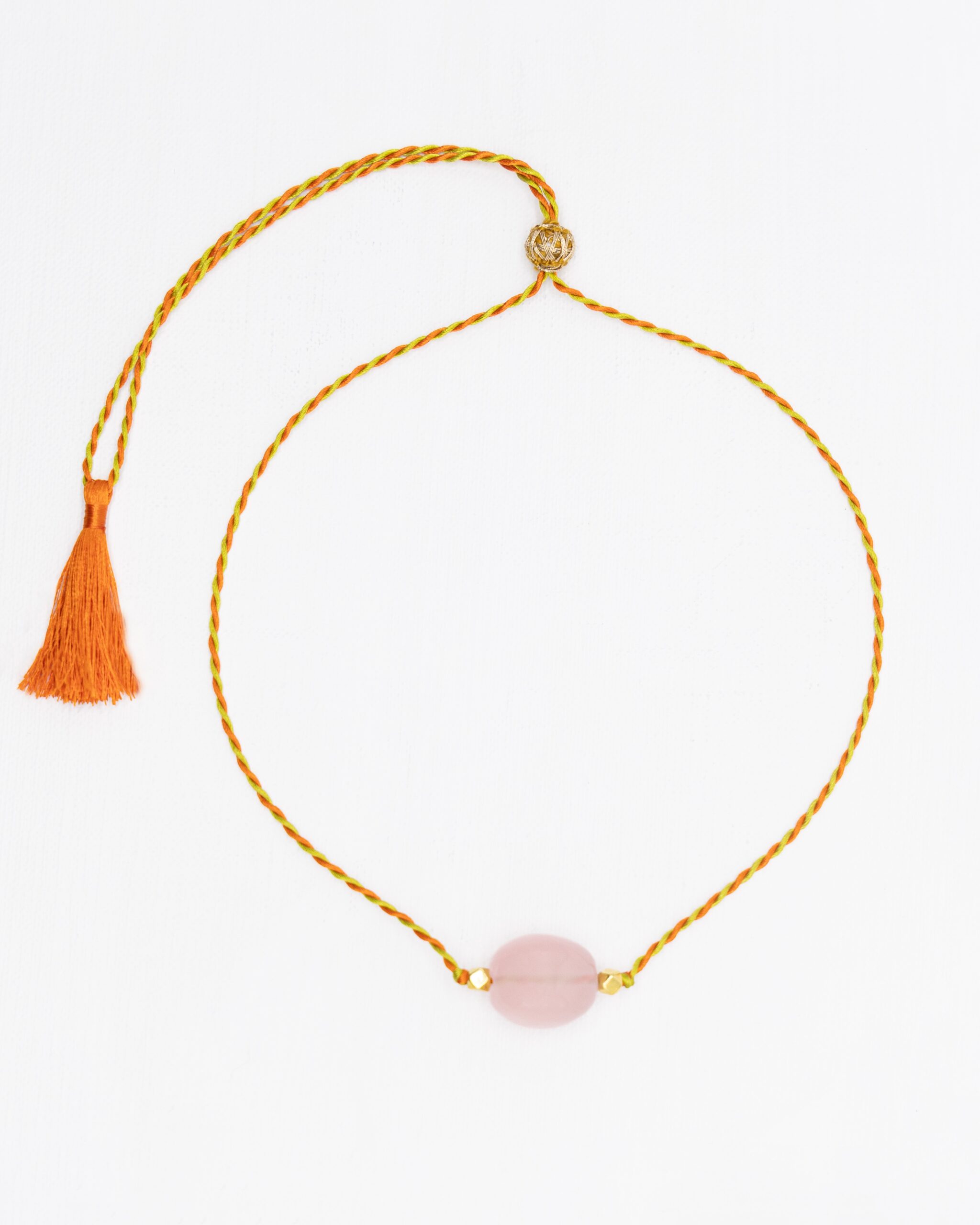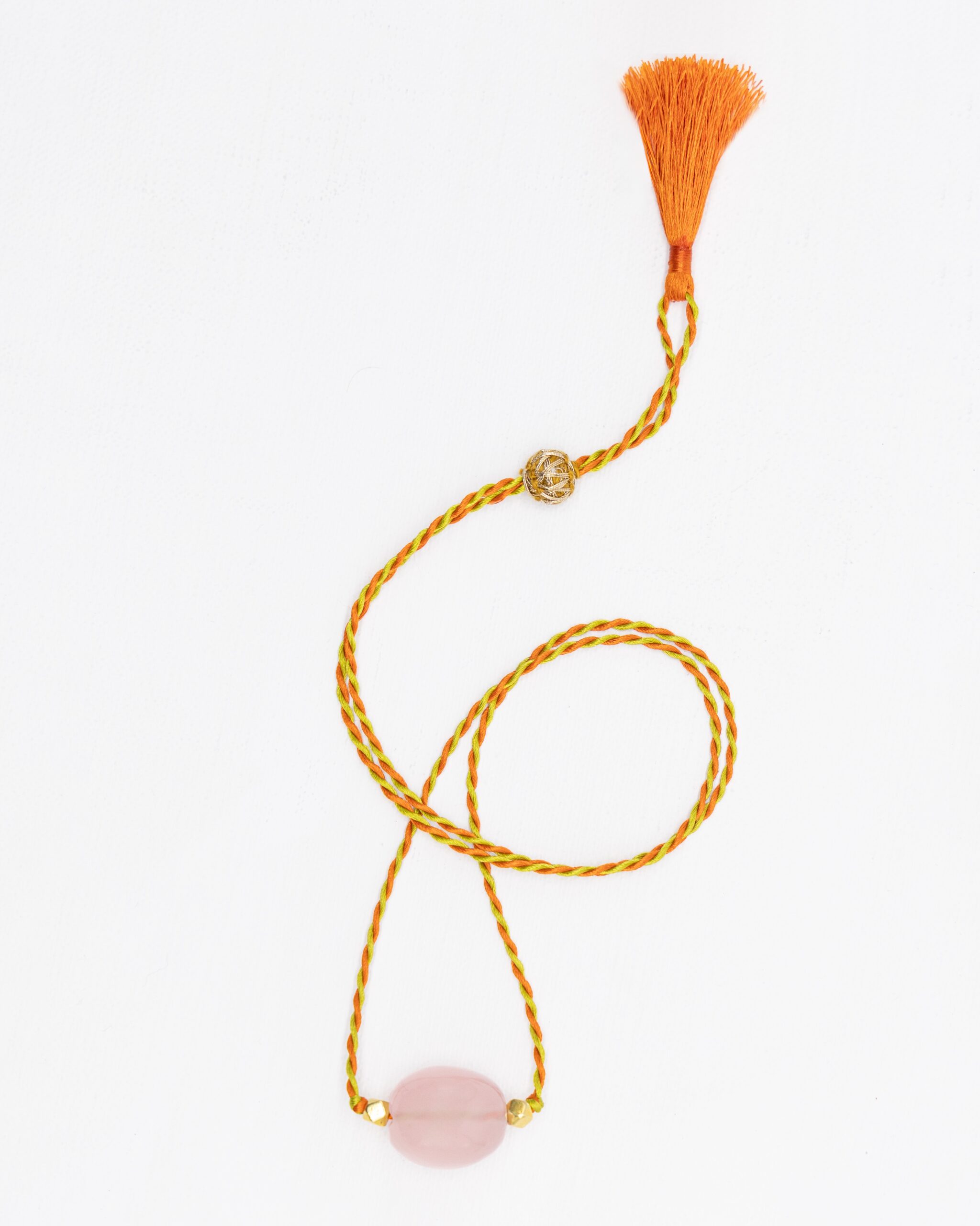 Our signature cords are hand-twisted in silk and cotton by traditional artisans in India. Each features a carved Snakefruit stone at its center, gold elements throughout, and an adjustable closure finished with a zari-thread slide and tassel.